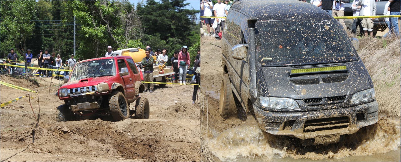 そして、2日目。参加者お待ちかねのメインイベント、特設のオフロードコースでタイムを競う「エクストリームレース」の開催です。その日の朝、レースの開始直前まで運営が工夫を重ねて作ったコースで、山場は3つ。車が1台通れるくらいの幅に、SUVの高さほどの起伏が続くモーグルセッション。歩くのも困難な大きな岩を積み上げたロックセッション。ゴール直前に設けられた、車が半分くらい浸かってしまう深さの池。難攻不落のコースに、大排気量のピックアップトラックから軽自動車まで、多種多様なSUV約40台が参戦しました。