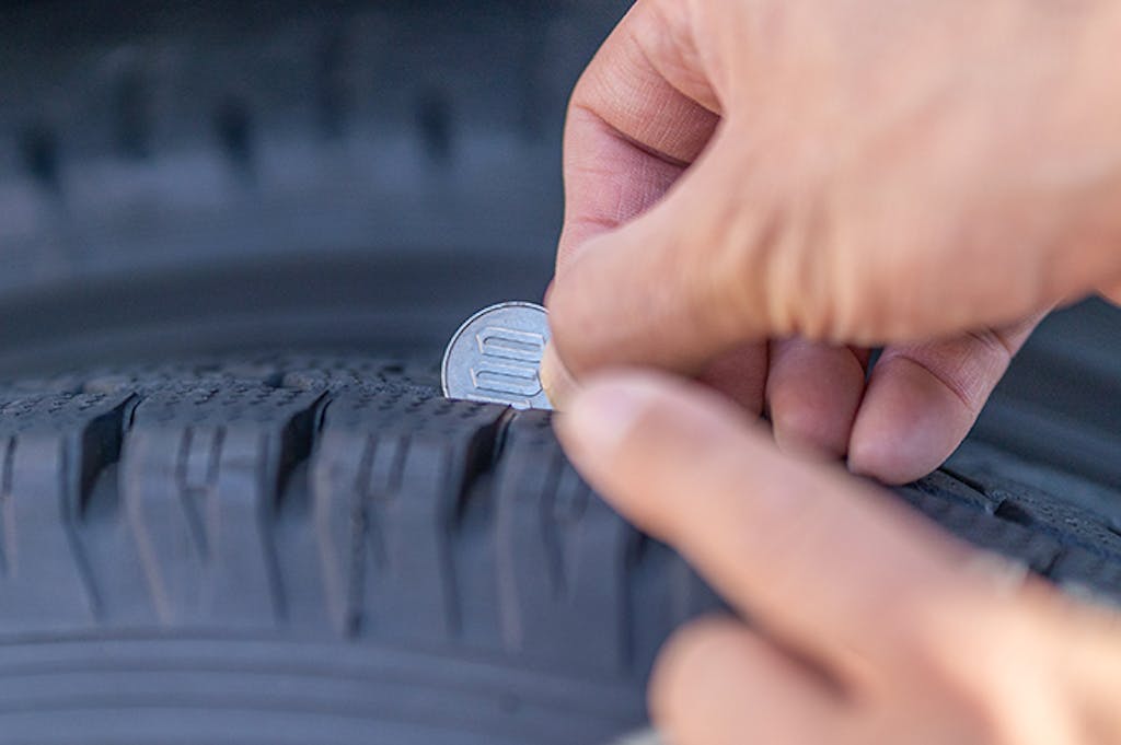 プラットホームが露出するのは、溝の深さが新品時の半分(50%摩耗)になったときです。このサインが1カ所でも現れたら、そのタイヤは冬道での性能を十分に発揮できなくなるため、冬用タイヤとしては使用できません。上の画像のように100円玉を使うと、残り溝の深さを簡易チェックできます。100円玉の端から「1」の数字までは、約5mm。スタッドレスタイヤの溝に100円玉を差し込んだときに「1」の数字が見えたら、タイヤ交換のサインです。
