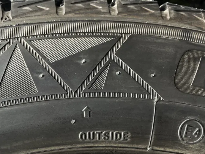 このタイプのタイヤには回転方向の指定はないため、左右どちらのタイヤとしても装着できます。ただし、内外の向きだけは必ず守る必要があります。タイヤを車に装着した状態で、外側から「OUTSIDE」の文字が見えていれば正しく取り付けられているということです。