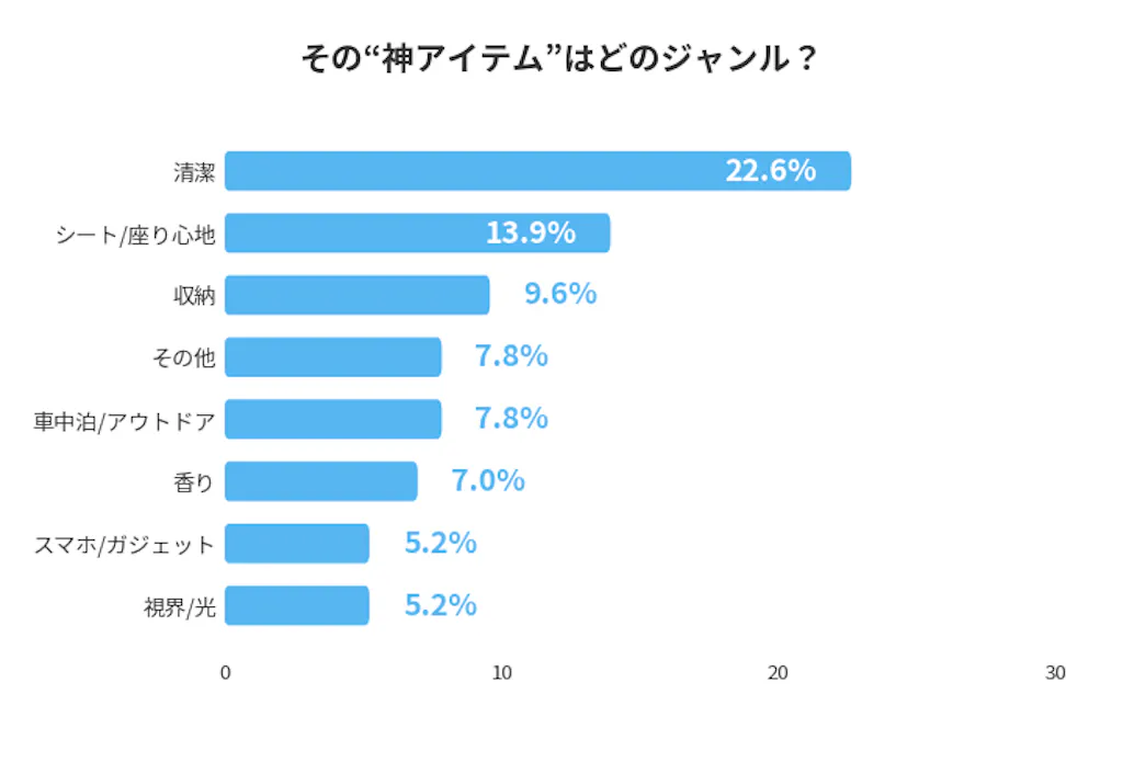 ジャンル別では「清潔」22.4%がトップ。具体的なアイテムを見ると、定番の消臭剤・シートカバーの中に個性が光るものもありました。