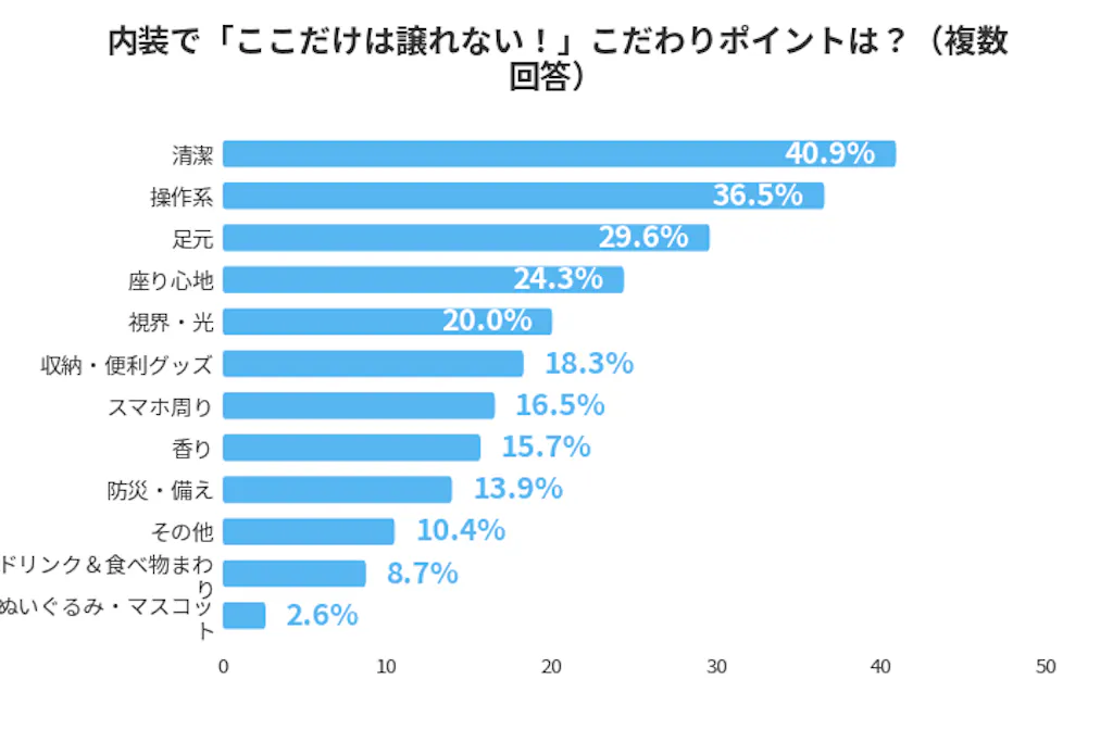 1位は「清潔(掃除のしやすさ/汚れ防止)」40.5%。2位「操作系(ハンドル/シフトノブ/ペダル)」36.2%、3位「足元(フロアマット)」29.3%と、実用・機能面が上位を占めます。