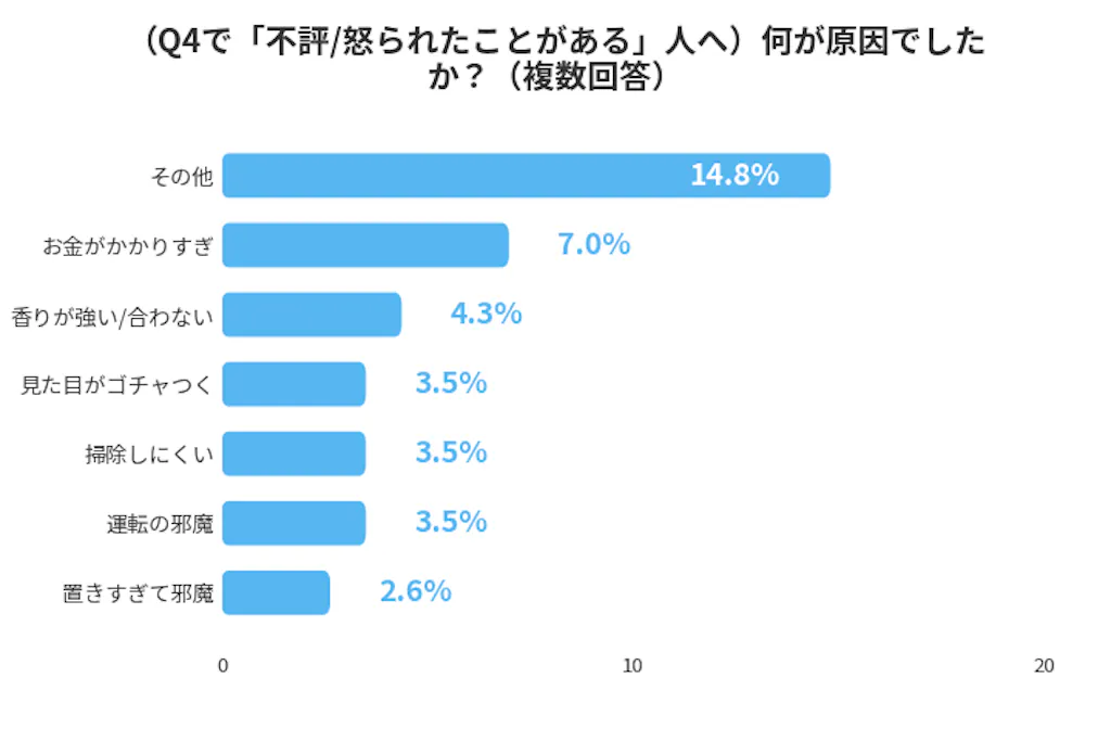 「お金がかかりすぎ」が7.0%でトップ。「香りが強い/合わない」が4.3%、「見た目がゴチャつく」が3.5%。こだわりの度が過ぎると同乗者からNGが出やすいようです。
