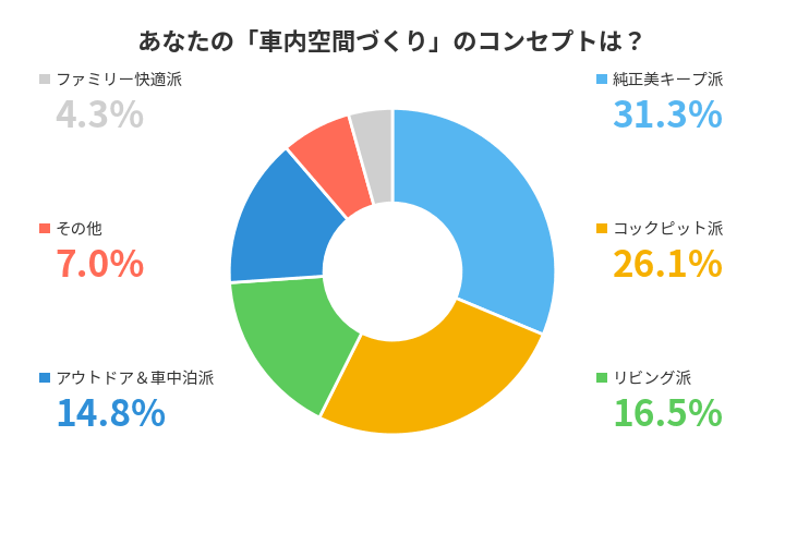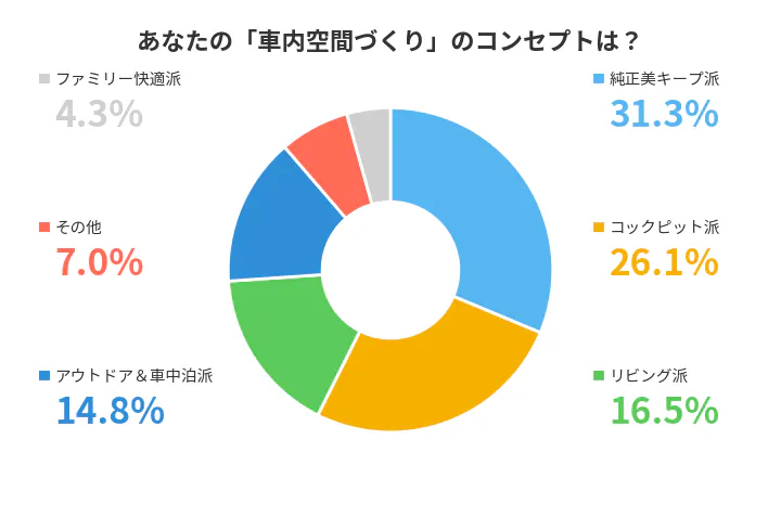 最も多かったのは「純正美キープ派(モノを置かない・増やさない)」で31.3%。次いで「コックピット派(機能美・ガジェット重視)」26.1%、「リビング派(リラックス重視)」16.5%と続きます。