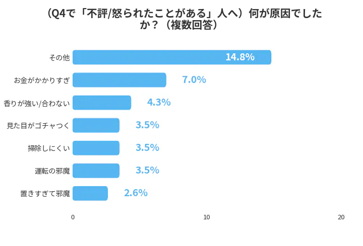 「お金がかかりすぎ」が7.0%でトップ。「香りが強い/合わない」が4.3%、「見た目がゴチャつく」が3.5%。こだわりの度が過ぎると同乗者からNGが出やすいようです。