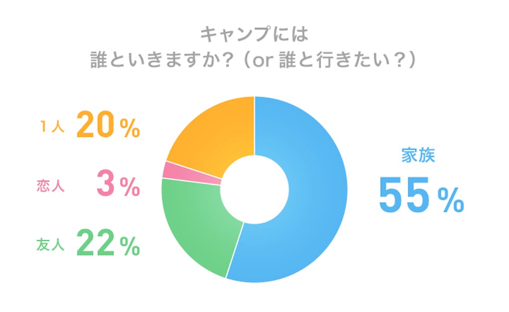 ご家族と行かれる(行きたい)方が半数を占めていますが、ひとりで行く(いきたい)という方も2割いらっしゃいますので、ソロキャンプも人気であることが伺えます。