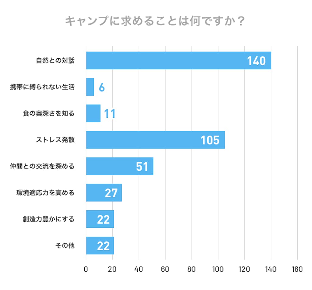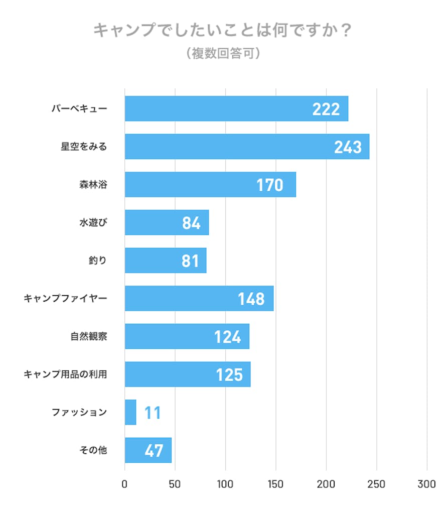 美味しいご飯を食べる、ということは皆さんの共通テーマのようです。「何を食べようかな?」と献立を考えることも、キャンプ前の1つの楽しみですよね。また、キレイな星空を見てボーッとすることや新しいキャンプ道具をワクワクしながら使うなんてことも醍醐味といえると思います。この他に“何もしない”という回答が多数ありました。キャンプにおいては、何かをしにいく、ということではなく、自然の中に身を委ねて時間を過ごす、ということがキャンプ本来の姿なのかもしれませんね。