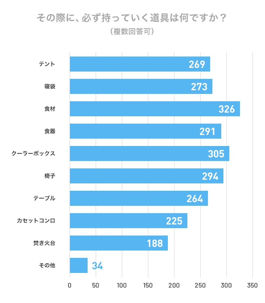 回答数をみると、上記選択肢のキャンプ道具はすべて持っていく、という方が大半を占める結果になりました。またその他回答としては、ポータブル電源やランタン、タープなどが候補にあがりました。中には、鉈と回答される方もおられたので、薪などを現地調達されているのではないでしょうか。