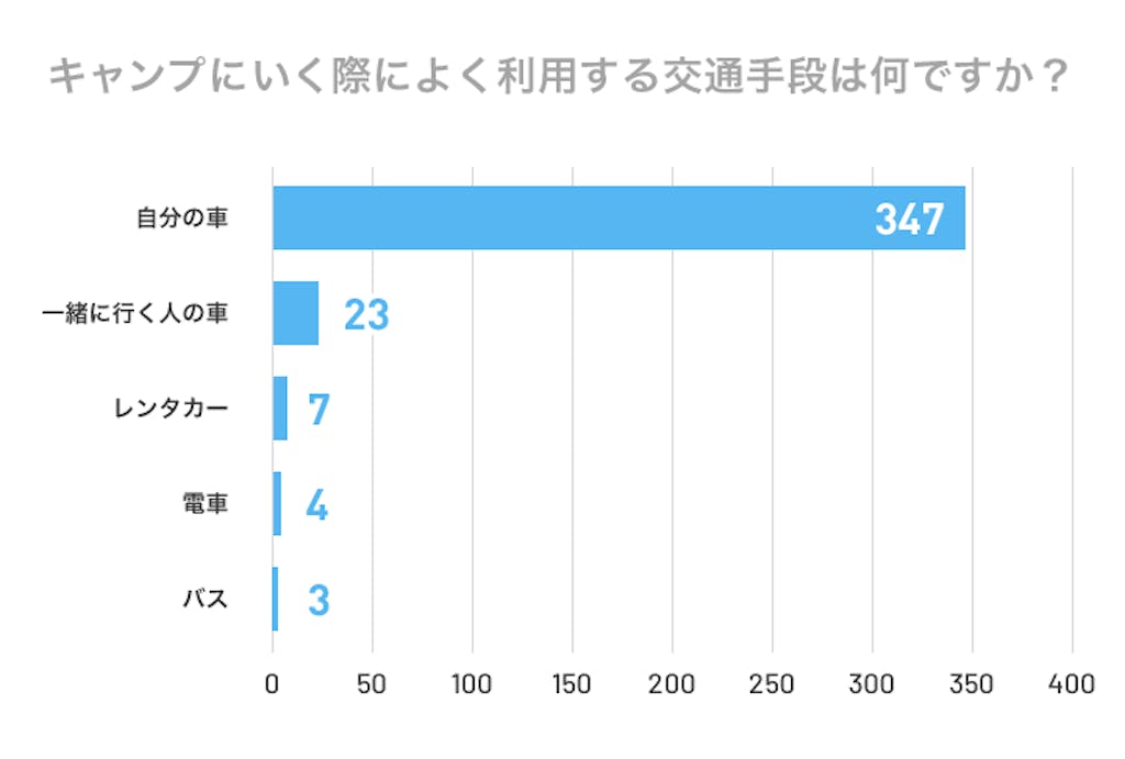 キャンプ道具などを持って行かれる方が大多数だと思いますので、車の利用が9割を占めている結果となりました。